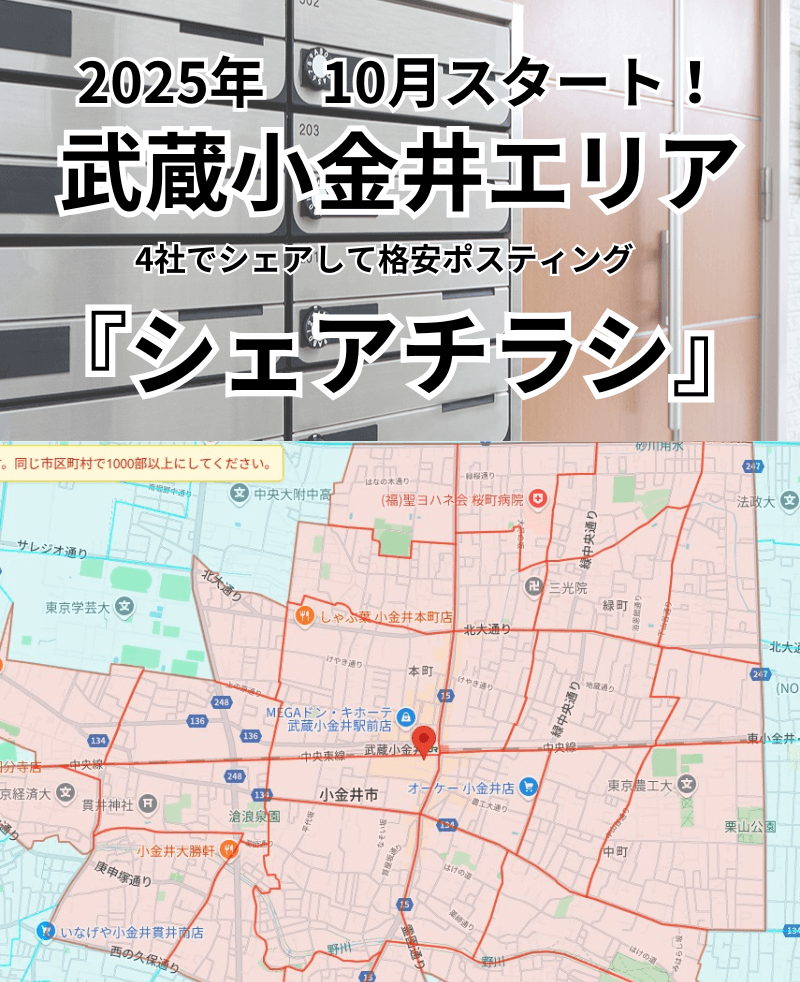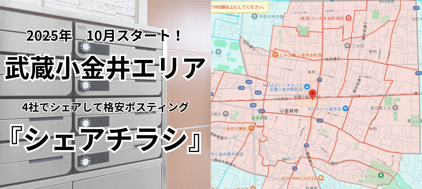 シェアチラシとは? シェアチラシとはご近所の店舗さん4社でチラシの掲載をシェアする事で格安でチラシのデザイン、印刷、ポスティングを丸投げできるこれまでにありそうでなかったサービスです。 デザイン ➕ 印刷 ➕ ポスティング 1万枚で月額33,000円(税込) 1万枚で月額33,000円(税込) 配布エリアはこちら 今すぐ日程を選択する \ ご利用頂いたお客様 / ~フィットネス業界~ エニタイムフィットネス様、JOYFIT様、ルネサンス様 ~買取業界~ 買取大吉様、大黒屋様、こやし屋様 ~美容業界~ POLA様、ホワイトイングカフェ様 、PMKメディカル様、癒し~ぷ様 ~教育業界~ カワイ楽器様、ネイス体操スクール様、パソコン教室わかるとできる様 ~その他~ BOOK OFF様、センチュリー21様、釣具買取専門店ウルラボ様 LINEで相談する こんなお悩みありませんか? チラシの費用が高い 一般的にはデザイン、印刷、1万枚のポスティングで9万円以上かかります。 手間がかかる 制作会社、印刷会社、ポスティング業社とそれぞれ連絡を取る必要があります。 費用対効果が不透明 費用対効果が分からないチラシに投資をすることが不安というお声をよく伺います。 シェアチラシを利用すると デザイン ➕ 印刷 ➕ ポスティング 1万枚で月額33,000円(税込) 1万枚で月額33,000円(税込) 店舗の近くポスティングできますか?、他にどの店舗が掲載されますか?などのご質問はLINEでご相談ください! 店舗の近くポスティングできますか?、他にどの店舗が掲載されますか?などのご質問はLINEでご相談ください! LINEで相談する シェアチラシのメリット 圧倒的な低価格 一般的にはデザイン、印刷、1万枚のポスティングで9万円以上かかります。シェアチラシは3分の1以下の価格です。 捨てられにくい 4社の店舗でシェアするチラシです。旦那さん、奥さん、お子さんの興味が違うので捨てられにくいです。 手間がかからない デザイン、印刷、ポスティングを弊社に丸投げできます。 オリジナルデザイン 弊社の専属チラシデザイナーがデザインを作成します。制作事例は下記をご確認ください。 制作事例 A4サイズで表2枠・裏2枠のチラシスペースを合計4社でシェア! \ 利用社数 1,100社突破 / スポーツジム、ヨガ、整骨院、エステサロン美容室、ダンススクール、英会話スクール、空手道場、パソコンスクール、不動産、飲食店、出張買取など これまで対応エリア(全国対応可能) 東京都、神奈川県、埼玉県、千葉県、北海道、宮城県、茨城県、静岡県、大阪府、京都府、広島県、岡山県、福岡県、熊本県、佐賀県、大分県、鹿児島県 他エリアの相談はこちら 料金プラン ※デザイン+印刷+1万枚のポスティング全て込みの料金です。 ※料金は税込表示です。 配布MAP 4か月間で同物件を2回配る『反復手法』を採用 配布スケジュール 4枠なくなり次第受付終了! 10/20〜 Aエリア 1万枚配布 11/20〜 Bエリア 1万枚配布 12/20〜 Aエリア 1万枚配布 01/20〜 Bエリア 1万枚配布 02/20〜 Aエリア 1万枚配布 03/20〜 Bエリア 1万枚配布 ※6カ月で合計6万枚を配布します。 4枠募集! 残り2枠! 1枠目:決定! 2枠目:決定! 3枠目:募集中 4枠目:募集中 デザイン+印刷+ポスティングを一貫してサポート デザイン 専属チラシデザイナーがデザイン作成! 印刷 カラー印刷 コート紙90㎏ ポスティング 店舗を中心に徒歩15分圏内が目安 1万枚で月額33,000円(税込) 1万枚で月額33,000円(税込) LINEで相談する 今すぐ日程を選択する ご利用の流れ STEP1 申し込み ご契約内容を確認後お申込みを行います。申し込みフォームはこちらです。 STEP2 打合せ デザイナーとメールかLINEでデザインの擦り合わせを行います。 STEP3 ポスティング開始 配布スケジュールやエリアをご確認ください。 STEP4 お支払い 当月分翌月払いとなります。お支払いはクレジットカードまたは銀行振込(一括)にてお願い致します。 STEP5 ご報告 4カ月間/8か月間は毎月ポスティングの開始&完了メールが届きます。 STEP6 サービス終了後 再ポスティングご希望の方は継続、完了ご希望の方は完了となります。 よくあるご質問 Q. いつからポスティングを開始しますか? 配布スケジュールをご確認ください。 Q. ポスティングエリアはどこですか? 店舗を中心に徒歩15分圏内を目安にポスティングを行います。 詳細は配布MAPをご確認ください。 Q. いつまでに申し込めばよろしいですか? 4枠埋まった時点で終了となります。まずはご連絡ください。 Q. 隣に掲載される店舗は何業界ですか? お気軽にご連絡いただけますとご回答させていただきます。 Q. どのようなプランがありますか? 4ヶ月、8ヶ月、12ヶ月のプランがございます。初めてご利用の方には4ヶ月プランをおすすめしております。詳細は料金プランをご確認ください。 LINEで相談する LINE お電話